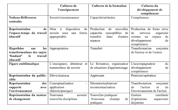 Enseignement, formation et développement de compétences peuvent se comparer entre eux en tant que cultures d’action éducative :